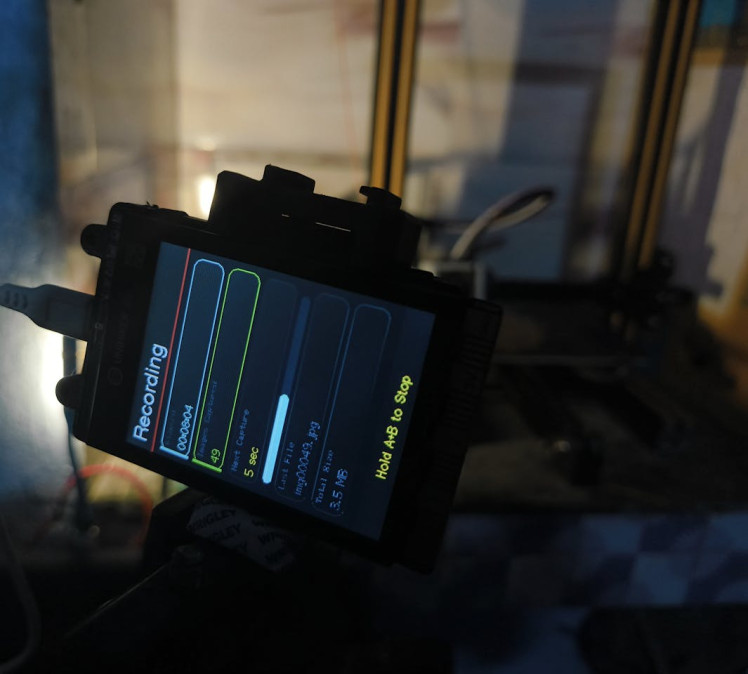 The camera was placed facing a 3D printer bed to capture the printing process from start to finish. Using a short capture interval and a lower resolution helped keep the recording smooth and stable.