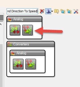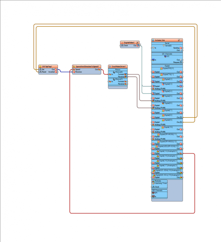 - Connect "SRFlipFlop1" pin Out to "SpeedAndDirectionToSpeed1" pin "reverse"