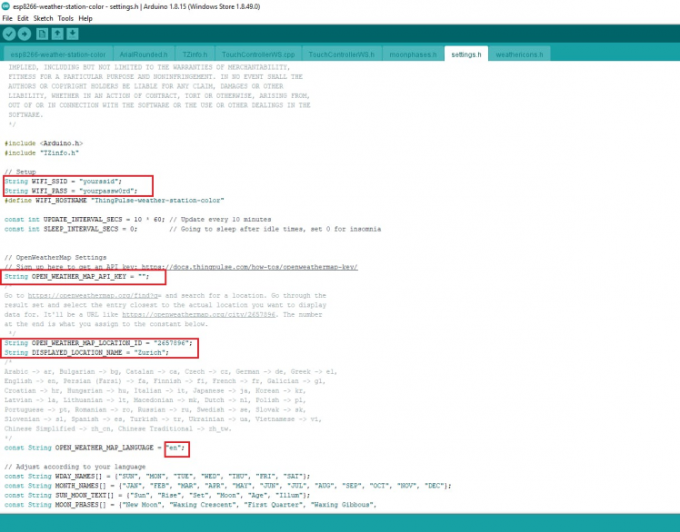 Download all librariesThe ThingPulse Weather Station Color depends on a number of other libraries.They need to be made available to the Arduino IDE for them to be compiled and linked into the final application.