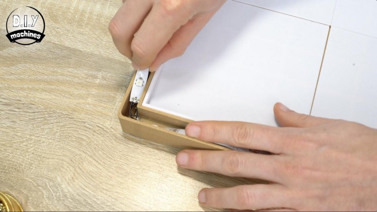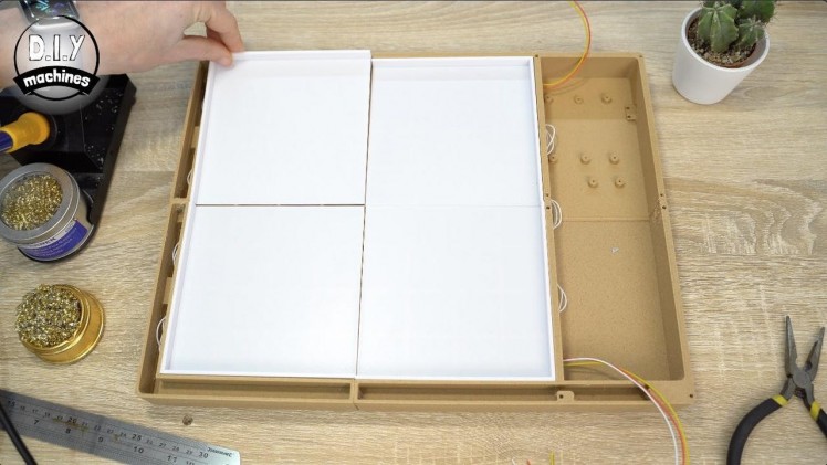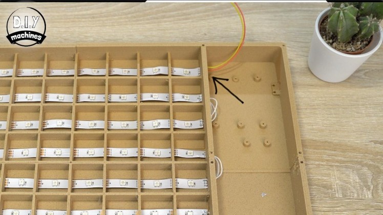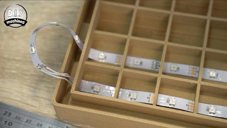 You should solder three 28cm long wires to the incoming end of one of the strips of LEDs. This first strip can then be slid into position from the bottom right whilst be careful not to catch the LEDs as they pass through the board.