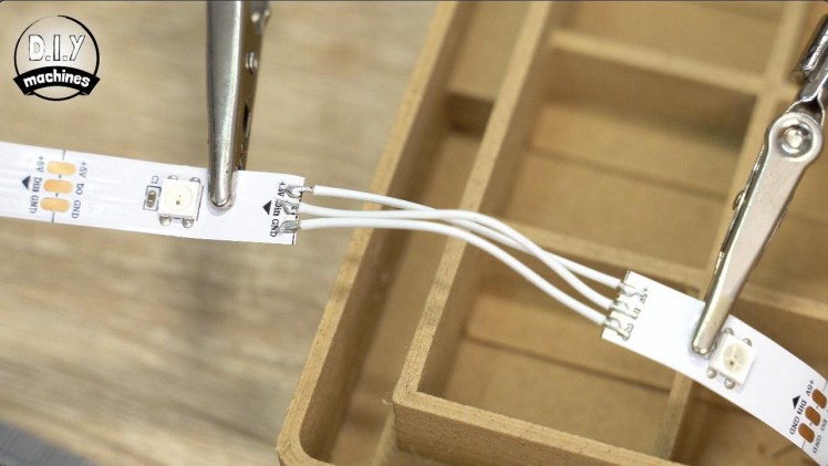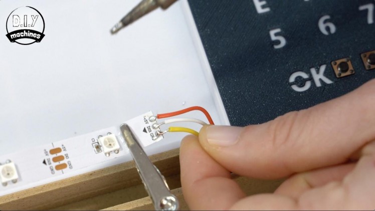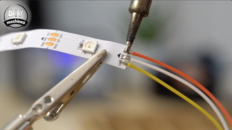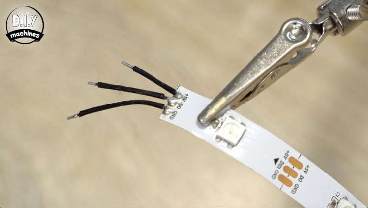 Solder them onto the outgoing end of one of the LED strips with the smallest wire connecting to the '+5V' pad, the 2.5cm wire to 'D0' and the 3m wire to 'GND'.