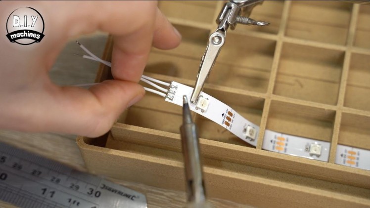 We will use sets of 5cm long wires to join each strip as we zig zag up through the chessboard. I suggest you prepare 21 5cm wires and tin there ends, then you can concentrate on the LED's strips as you go.