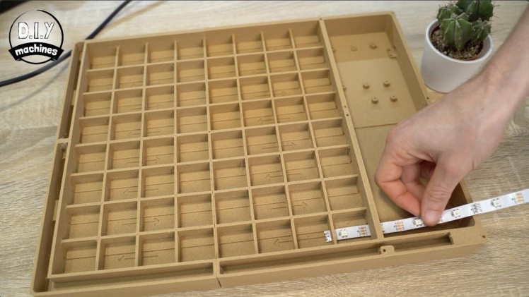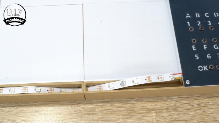 Pass the strip carefully through the tunnel in the first trench running along the front edge of the chessboard. Follow the curve of the wires as you go around the corner and then tuck the second strip under the second tunnel. Use some glue to help keep the LED's fitted flat onto the 3D printed ledge and inline with each row and column on the main playing surface.