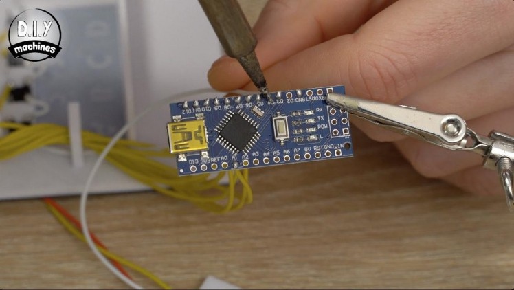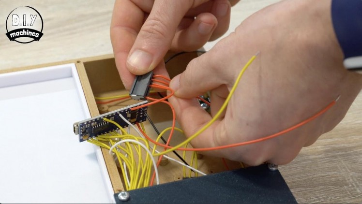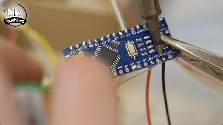 I have re-attached the wiring diagram above for your convenience. The wires from the buttons are soldered onto the Arduino Nano as follows:
