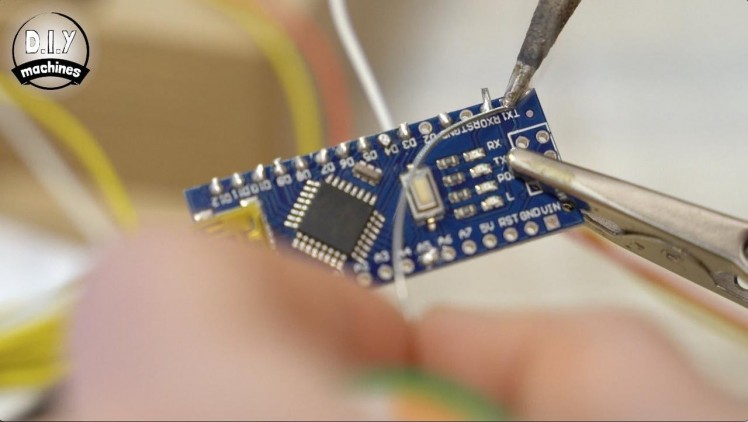 We can also add more two wires to the Arduino. Solder a seperate 15cm wire to each of the Arduinos serial pins. These are labelled as 'RX0' and 'TX1'. We will use these in a later step.
