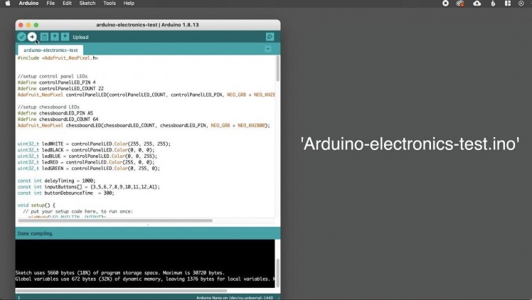 We will soon be connecting additional electronics to the two serial connections on the Arduino Nano. This is extremely likely to interfere with our ability to communicate with the Nano via USB so connect it to your computer again but this time you need to upload the file named 'Chess_Simp, ino'.