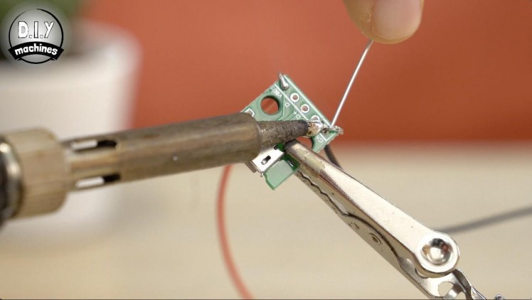 You will need the aforementioned female USB port on a DIP board. Prepare two 12cm wires and solder one to the 'GND' connection of the board and the one the 'VBUS'.