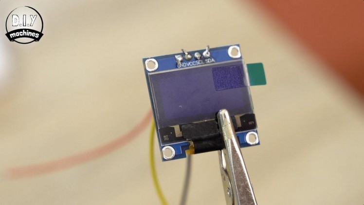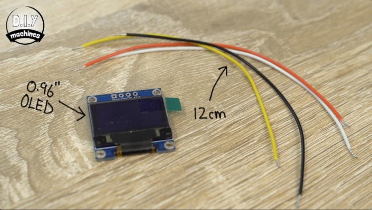 To prepare our OLED screen for use latercut, tin, and then connect four 12cm long wires to the holes marked as 'GND', 'VCC', 'SCL' and 'SDA'.