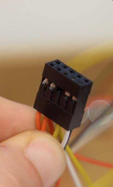 When looking at the back of the 5x2 Dupont housing the top left most pin wire should be the VA wire from the LLC. The wire below this should be the SDA wire coming from the OLED screen, which is followed immediately below by the SCL wire for the screen. We then skip the next hole and into the bottom left most hole insert a new wire and then connect this to the block of ground wires.
