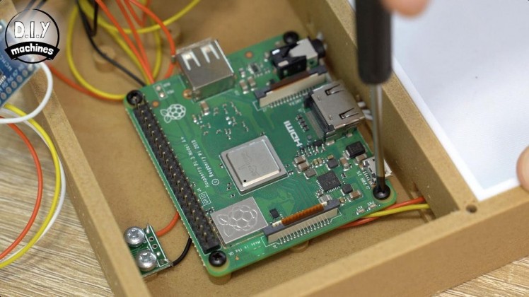 Ensure you have the micro SD card still inserted into the Raspberry Pi and then fix it to the four standoffs in the printed chessboard using the four 2.5mm screws.
