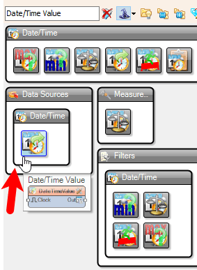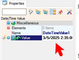 - Select "DateTimeValue1" and in the properties window set under "Value" current time & date