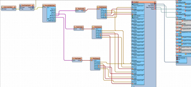 - Connect "MultiSource2" pin [Pin[4]] to "Display1" pin [Elements.Draw Angled Line1.Clock]