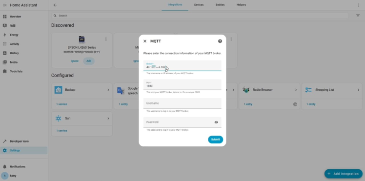 - Server address: the IP address of the MQTT broker.