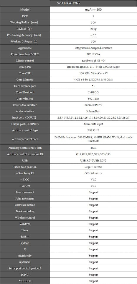 myArm 300 PiThe myArm 300 Pi is an innovative collaborative robotic arm with a symmetrical configuration, boasting 7 DOF. Its design style continues the compact and lightweight features of the myCobot series. Equipped with 7 high-precision servo motors, the myArm has a maximum working radius of 300mm and a maximum payload capacity of 200g at the end effector.Its impressive repeatability ensures a positioning accuracy of up to ±0.5mm, guaranteeing precise and reliable performance.