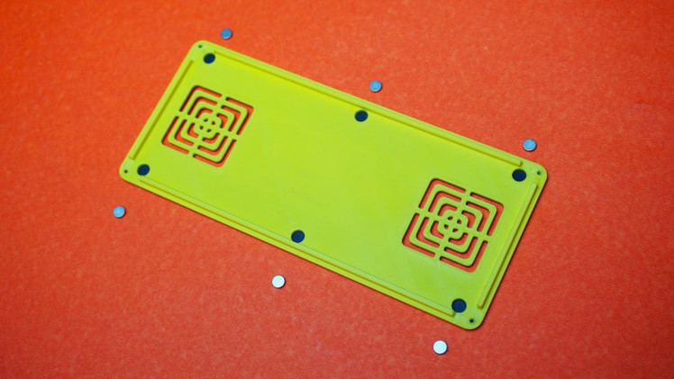 Take the 3D-printed cover and six 5mm magnets, then press the magnets into the designated holes.