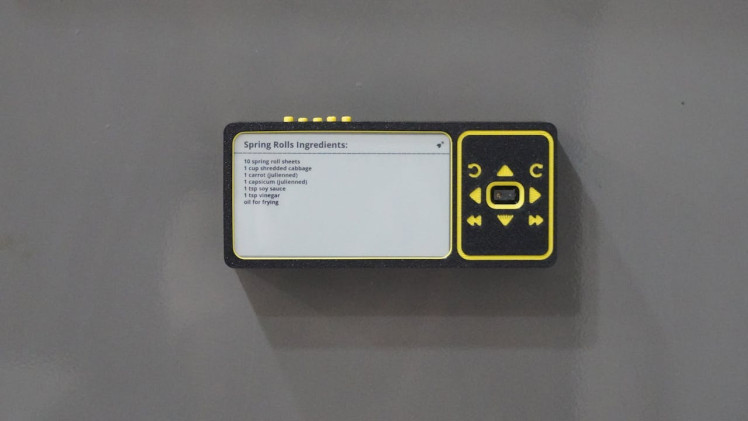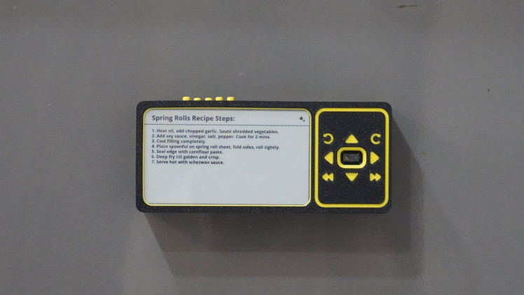 Built around a 4.7" E-Ink display, a gesture sensor, and a rechargeable 18650 battery, this sleek, modern device operates with simple hand gestures. No messy touchscreens, no cluttered recipe books, just wave right for a new meal idea, swipe up to reveal step-by-step instructions, and swipe down to return. Plus, with its custom 3D-printed case and magnetic mount, it blends seamlessly into any kitchen setup.