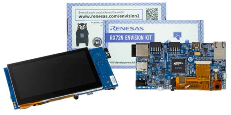 - RX72N Envision kit comes with a WQVGA LCD with a capacitive touch panel allowing GUI development using an LCD controller and a 2D drawing engine.