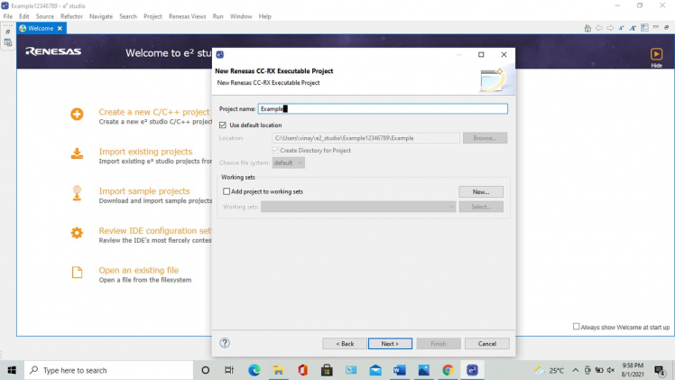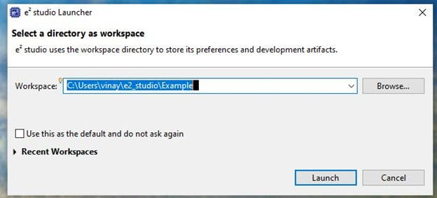 3. After Successful Installation Of e2 studio Open The e2 studio. After a few seconds Workspace Window will pop up Here we need to give a name to Workspace. I have given the Workspace Name as an Example. After entering the workspace name Enter launch.