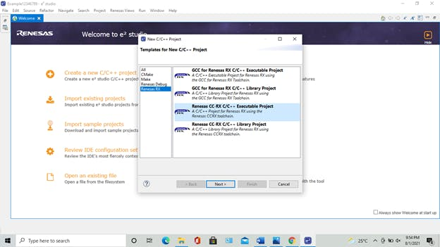 5. Then Select Renesas CC RX C/C++ Executable Project and click Next.