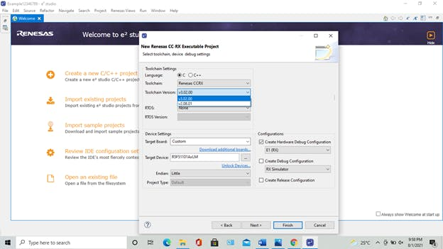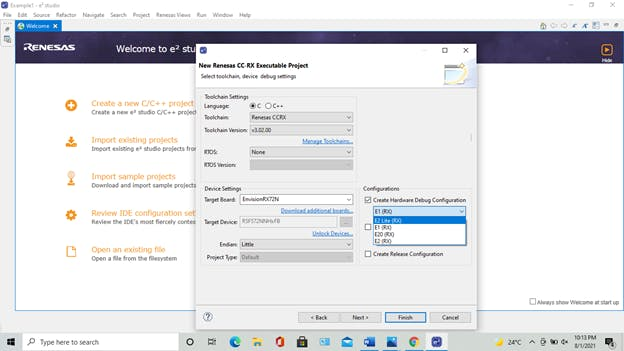 Select Hardware Debug Configuration as E2 Lite RX and Click Next.