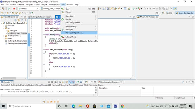 In order to upload the code, we have to set Debug configuration. To make the settings Go to Run Tab and select Debug Configuration, From the Debugger Tab make The Main clock Source as Extal. Extal Frequency As 16 Mhz, Connection Type as Fine, Power Target From The Emulator as NO, And Click Apply.