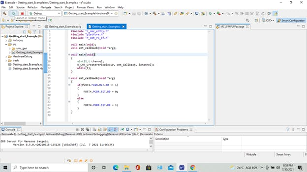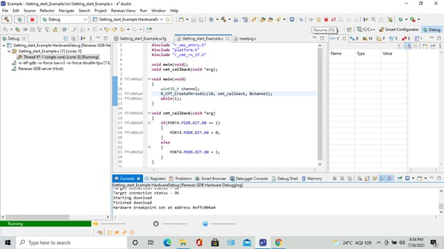 To Run The Code On the RX72N ENVISION KIT Press The PLAY/Resume Tab. If the device is successful The status will be displayed As Running