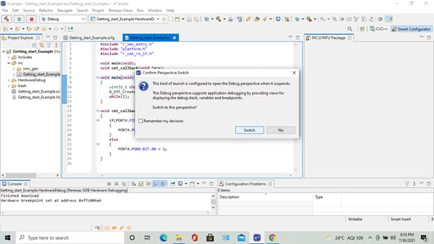 Click on Launch in Debug Mode, The software starts to upload the code to the RX72N. When the perspective switch window pop-ups select Switch status of uploading code is displayed as Finished Download.