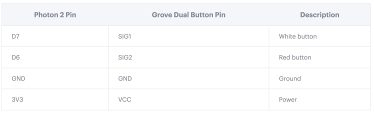 The Grove dual button utilizes two digital pins on the Photon 2.