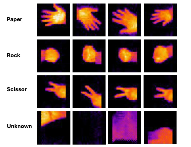 We will collect thermal images for three hand gesture classes: rock, scissors, paper, and several background images called unknown. The thermal sensors capture real-time temperature readings, which are then converted into thermal images using color mappings. These images are saved onto a microSD card built into the TFT display, ensuring the data can be conveniently accessed later for training. Prior to uploading them to Edge Impulse Studio, the images are processed to ensure they conform to a uniform size, specifically being padded to become 32×32 pixel square images suitable for training purposes.