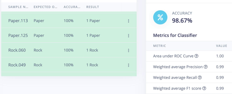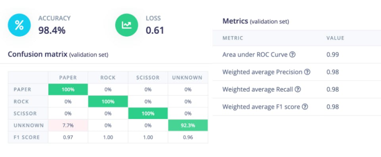 Now, click the “Start training” button. The training process will take a few minutes to complete. Once the training is completed we can see the accuracy and metrics as shown below.