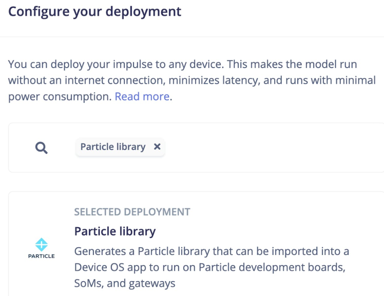 The Edge Impulse Studio officially supports Particle Photon 2, so on the Deployment page, select Particle Library.