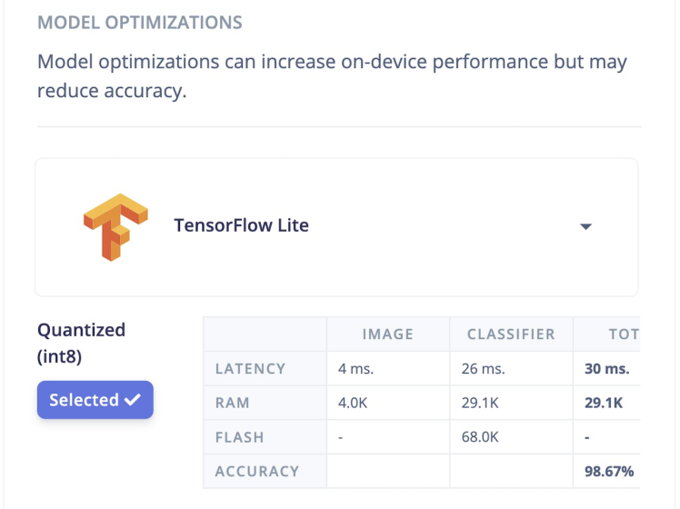 For the Select Optimizations option, choose TensorFlow Lite and Quantized (Int8).