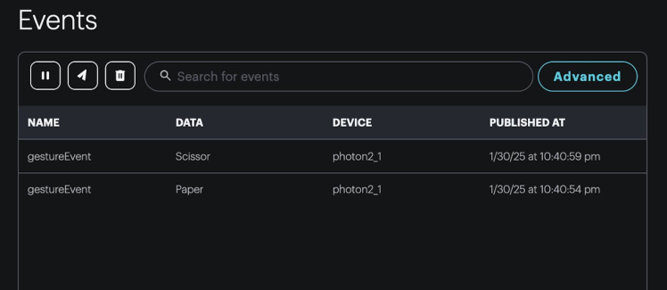 }We have set up another Photon 2 with minimal code, which subscribes to a topic and turns the onboard RGB LED on and off based on the received messages: “paper” and “scissor”, respectively.