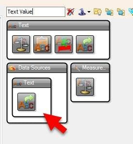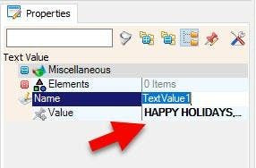 - Select "TextValue1" and in the properties window under "Value" set the text that you want to display, example "HELLO WORLD"