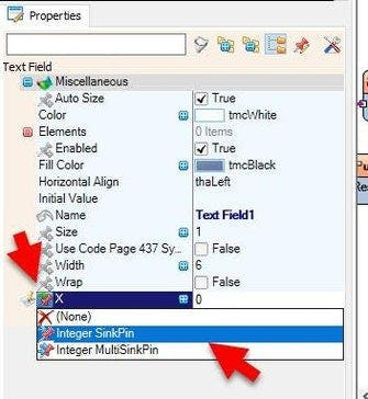 - Double click on the "LedController1" and in the PixelGroups window drag "2D Graphics" to the left side and set "Mirror Horizontal" to True, "Reverse Horizontal" to True, "Width" to 96, select "Elements" and click on the 3 dots button and in the Elements window drag "Text Field" to the left and in the properties window select "X" and click on the pin icon and select "Integer SinkPin"