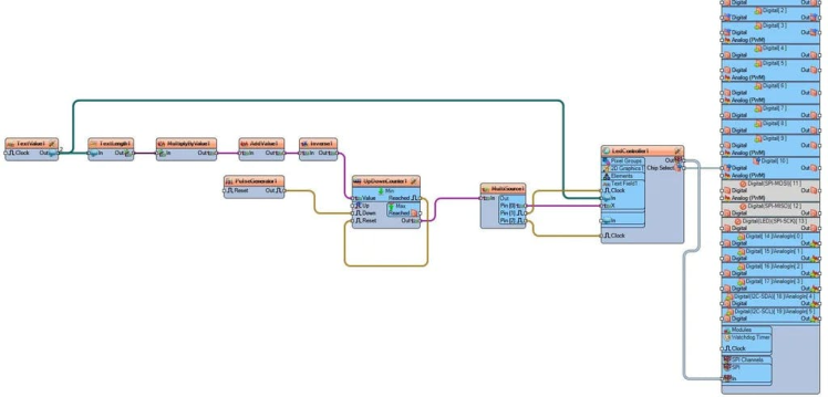 - Connect MultiSource1 > OutputPins > Pin [1] to LedController1 > PixelGroups > 2D Graphics1 > Elements > Text Field1 pin [ClockIn]