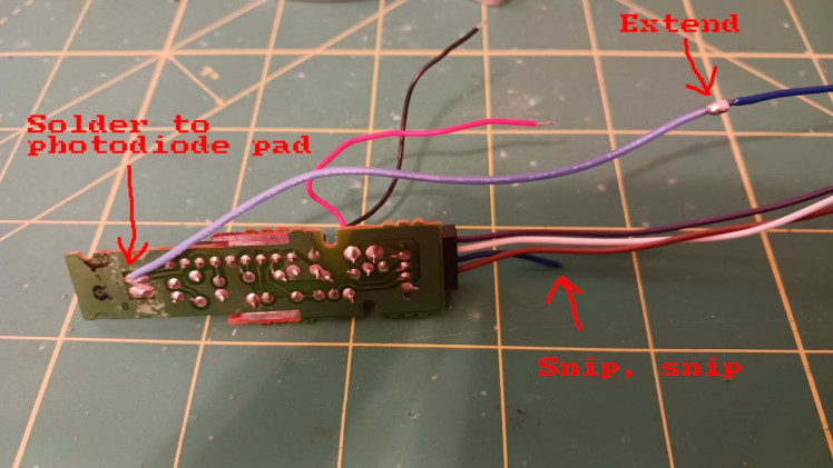 How It WorksThe receiverThe NES Zapper has anti-cheating mechanisms built into it that prevent it from being used for anything other than a light sensor that is tuned to the specific frequency of the electron beam of a CRT TV. After making my Zapper deep dive video, I realized that I could bypass these protections by rerouting the "hit" indicator signal directly to the photodiode itself.