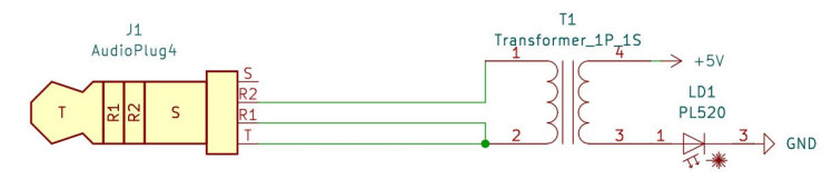 Here is a schematic for the transmitter. It is quite simple. The audio comes in through a TRRS jack, from a microphone, phone, or whatever else you want to use. That signal is passed through a transformer, which removes any DC components from the signal.