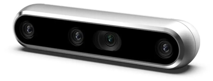 The 3D camera we are discussing today is RealSense, developed by Intel, a type of depth-sensing camera. As seen in the image, this camera has four lenses, including an infrared laser projector, two infrared cameras, and a color camera. These lenses serve specific purposes: