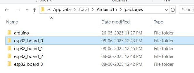 - Identify Installed ESP32 Board Instances In this folder, you will see all the ESP32 board folders installed, such as: esp32_board_0, esp32_board_1, esp32_board_2, etc.