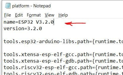 - Find the entry: name=ESP32 Arduino Edit it to: name=ESP32 Vx.x.x(Replace Vx.x.x with the actual version number, e.g., V2.0.10.)
