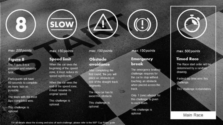 The cup has 5 different challenges whereby only the timed race is mandatory:
