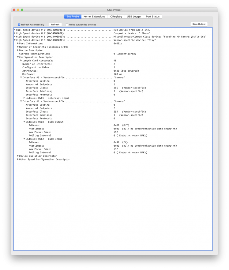 At the very beginning I used a Mac build in USB probe tool to figure out which communication protocol and path the camera uses. Like you can see on the following image, the camera simply uses two bulk endpoints - one for data IN and one for data OUT - in a vendor specific class. Interface #0 is not further implemented in the Pixy2 USB driver code.