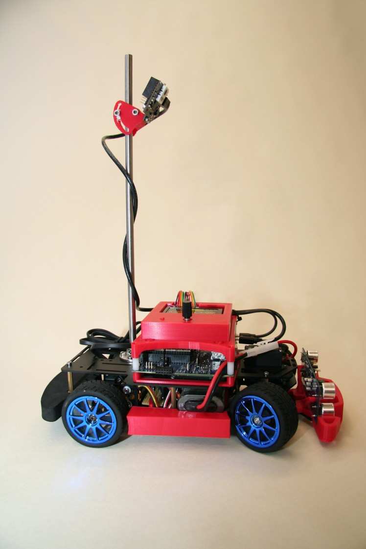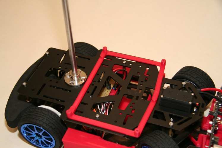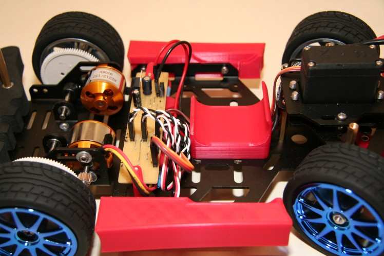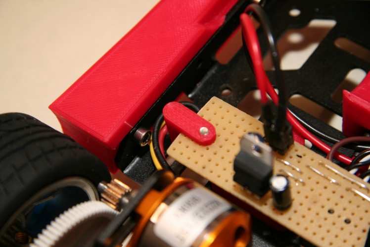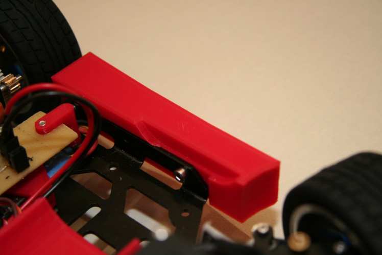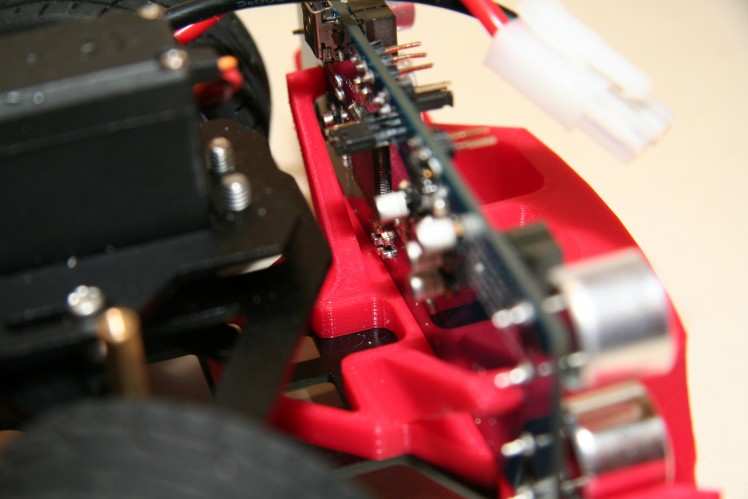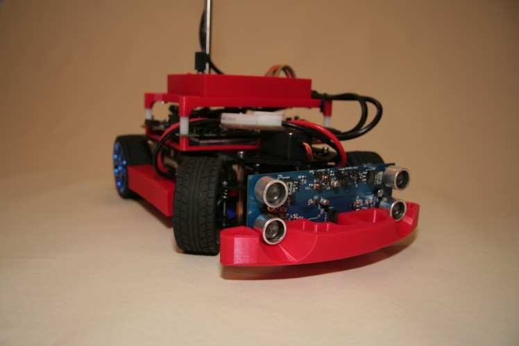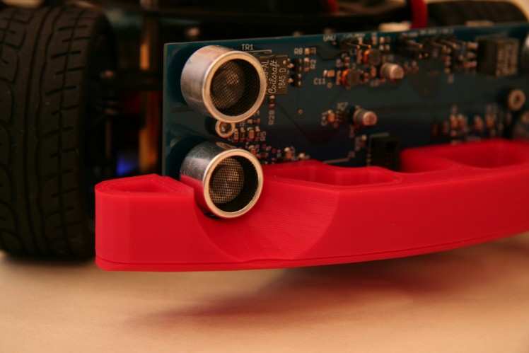 A small mount is holding the ultrasonic board in place while the sensors are protected by a custom front bumper replacing the original foam bumper.