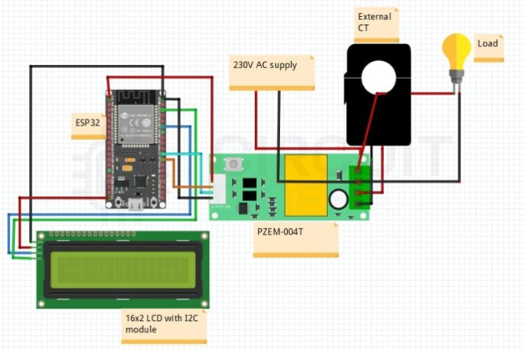 How It Works- Measurement: The PZEM-004T module measures AC parameters using its internal metering IC and an external current transformer