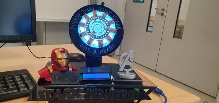 DIY IRON ARC REACTOR MK1. It has 2 modes, there is lightshow and manual colour selection using a button selector. It also have a special dimmable LED background lighting and a LED screen to display Tony Starks famous last phrase "LOVE YOU 3000".