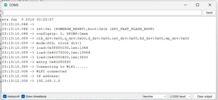 }Testing the Web ServerTo test the web server, you need to upload the code to the ESP32 board and open the serial monitor. You should see the IP address of the ESP32, which is something like 192.168.1.8