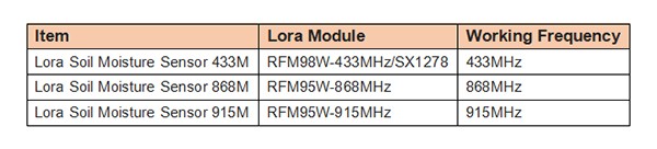 Lora Soil Moisture integrated the Lora Module, there are three frequencies, please select the proper one: