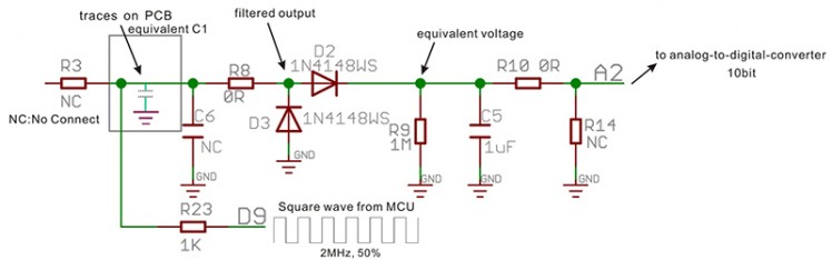 As the schematic shows, 2MHz square wave (output by internal timer1, D9 of 328P) is output from the chip through a resistor into a big pad(that is PCB traces), that together with the surrounding soil, forms a parasitic capacitor C1. Resistor R23 and the capacitor C1 form a low pass filter whose cutoff frequency changes with changing capacitance. As the soil moisture changes, the capacitance of C1 changes, so we can get the soil moisture status by checking the final voltage on the R9.