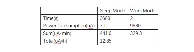 We tested the average power consumption when working is 9.88mA and the low power consumption when sleeping is 7.1uA. If use 1000mAh 2*AAA batteries, it can be worked for more than 77821 hours(more than 3 years) in theory. However, what is needs to be noticed is that the final lifetime depends on the life of the battery and PCB.